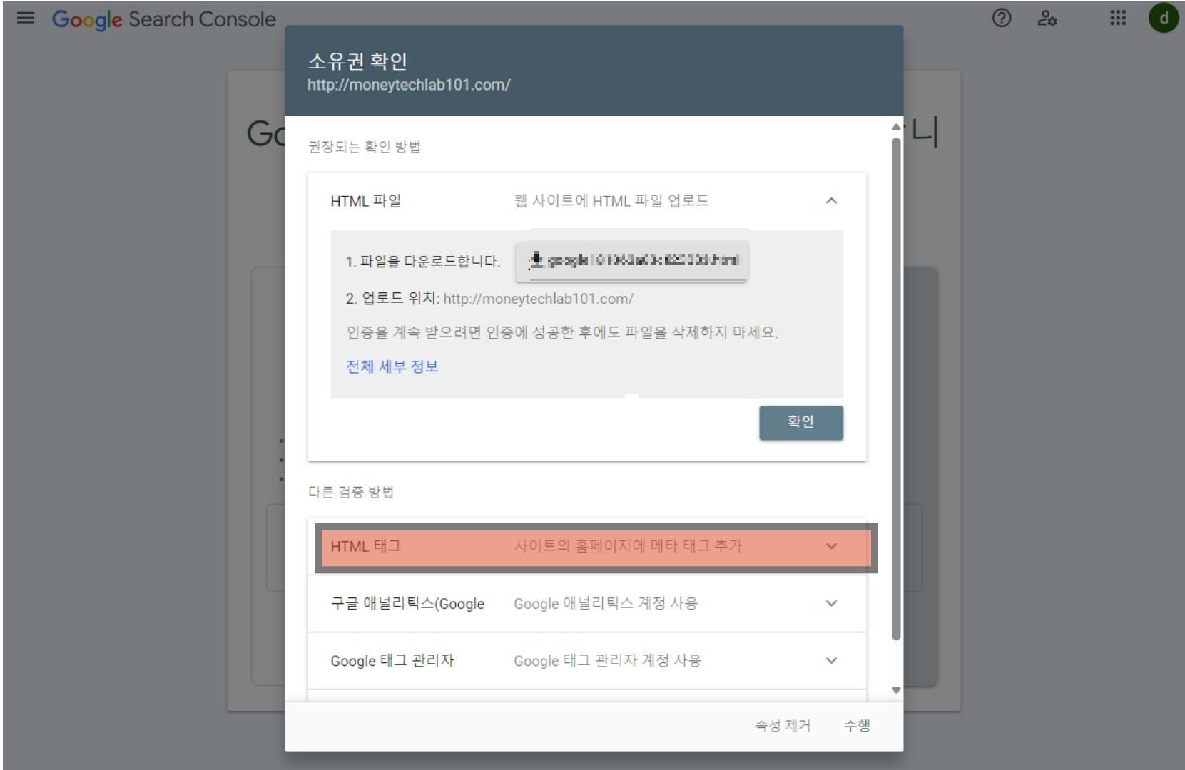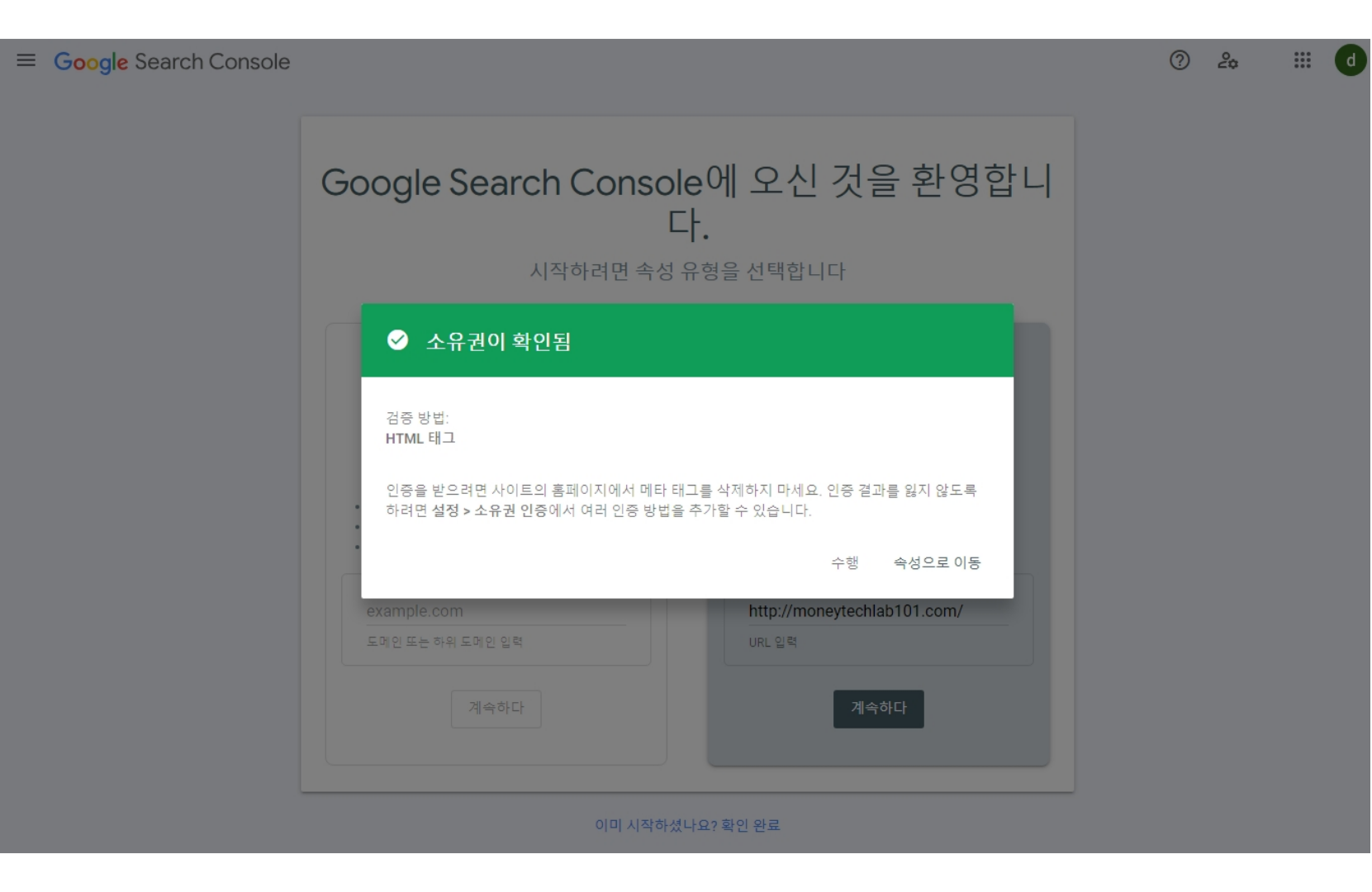 확인, 완료 버튼 누르고 인증을 확인하고 소유권이 확인 되었다는 팝업 창이 뜨면 완료된것입니다.