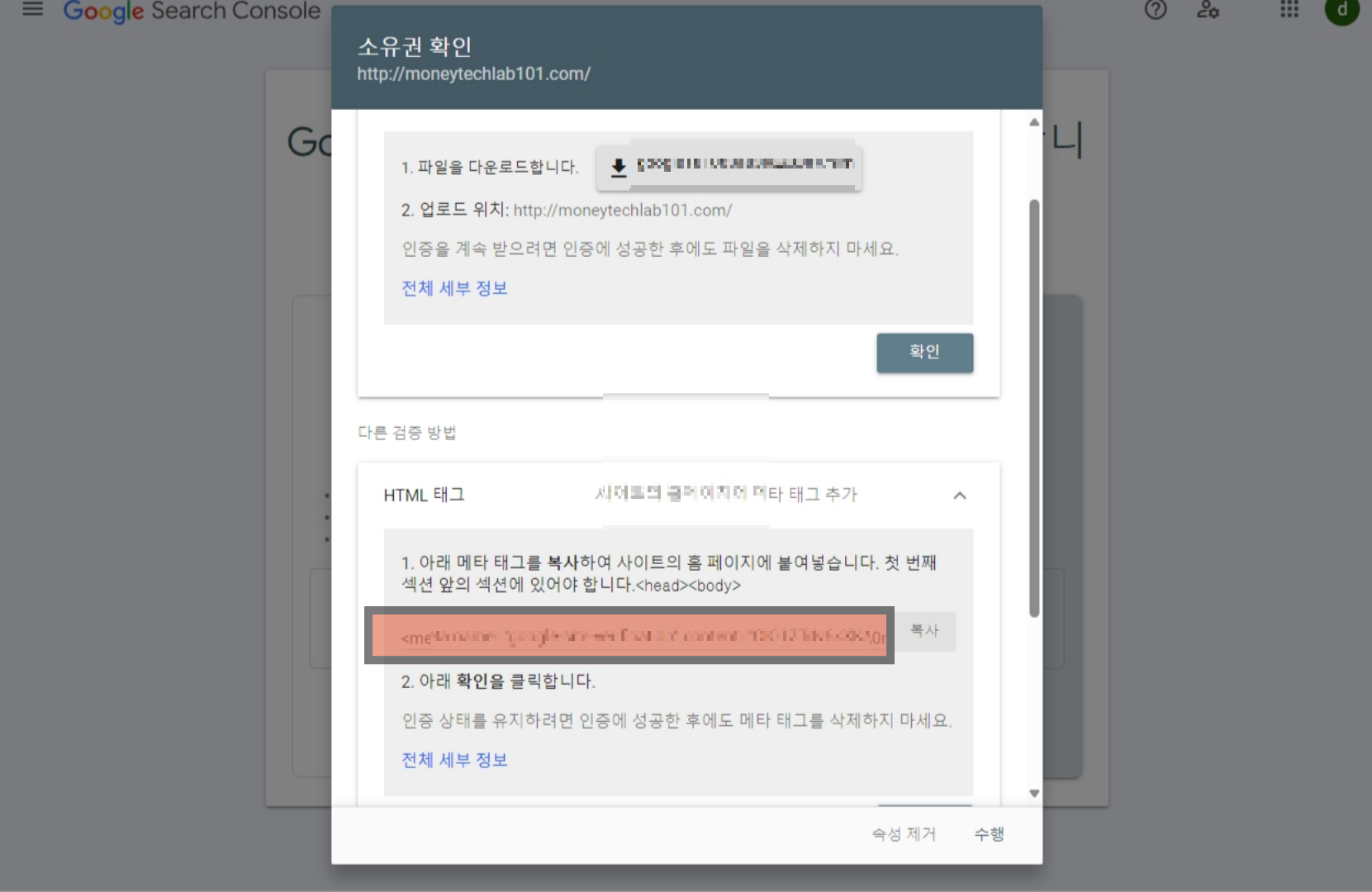 - 구글 서치 콘솔에서 HTML 태그를 복사한 후 티스토리 블로그로 돌아옵니다.