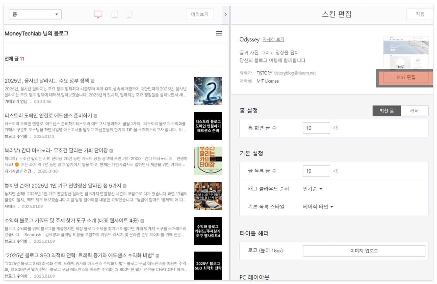 - 스킨편집에서 오른쪽 상단에 HTML 편집 누릅니다.