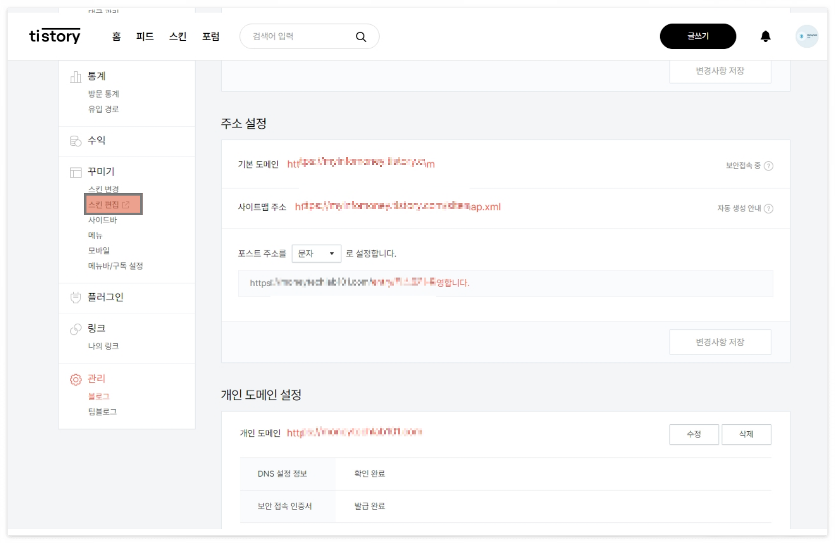 제 경우에는 이미 티스토리 주소로 블로그를 개설해서 포스팅은 일정부분 한 이후에 도메인을 연결했고, 이번에 새로 구입한 도메인 주소를 넣습니다.