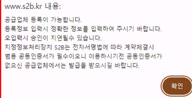 공급업체 등록이 가능하면 아래와 같은 팝업창이 뜹니다.