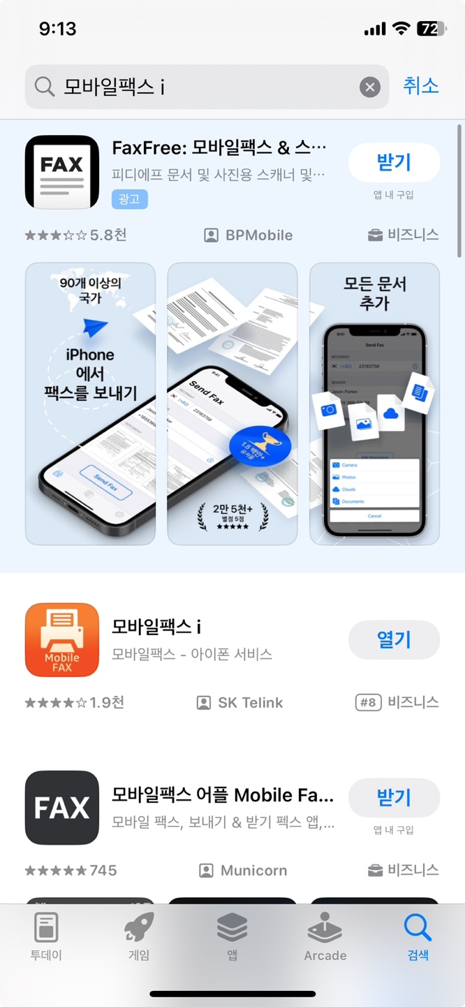모바일 FAX 를 검색하면 여러 어플이 나옵니다.