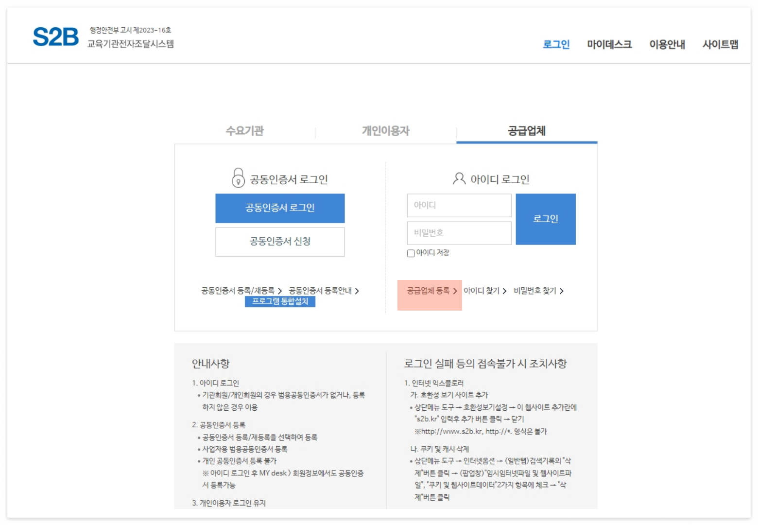 수요기관, 개인이용자, 공급업체중에 공급업체 탭을 선택합니다.