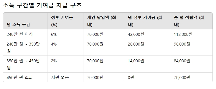 - 소득 2,400만원 이하: 납입금의 6% 기여금