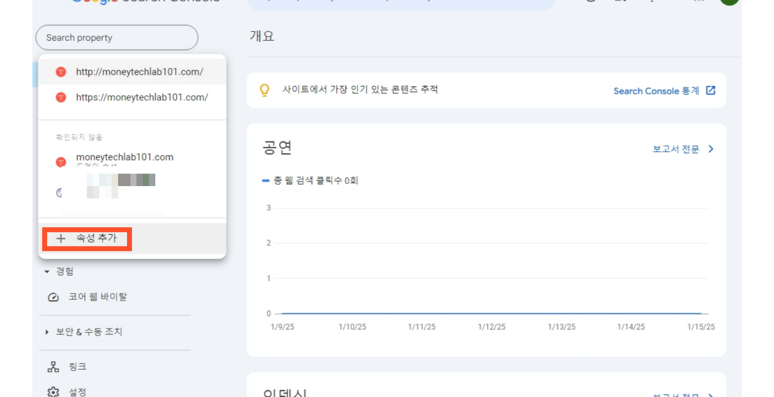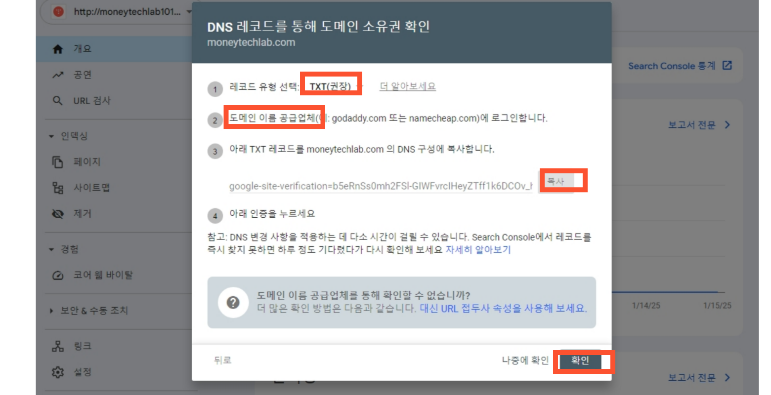 1. 구글 서치콘솔 접속하기- 도메인 속성 유형 선택- 속성추가(웹사이트 추가) - DNS 속성추가로 소유권확인하기 - TXT 코드 복사